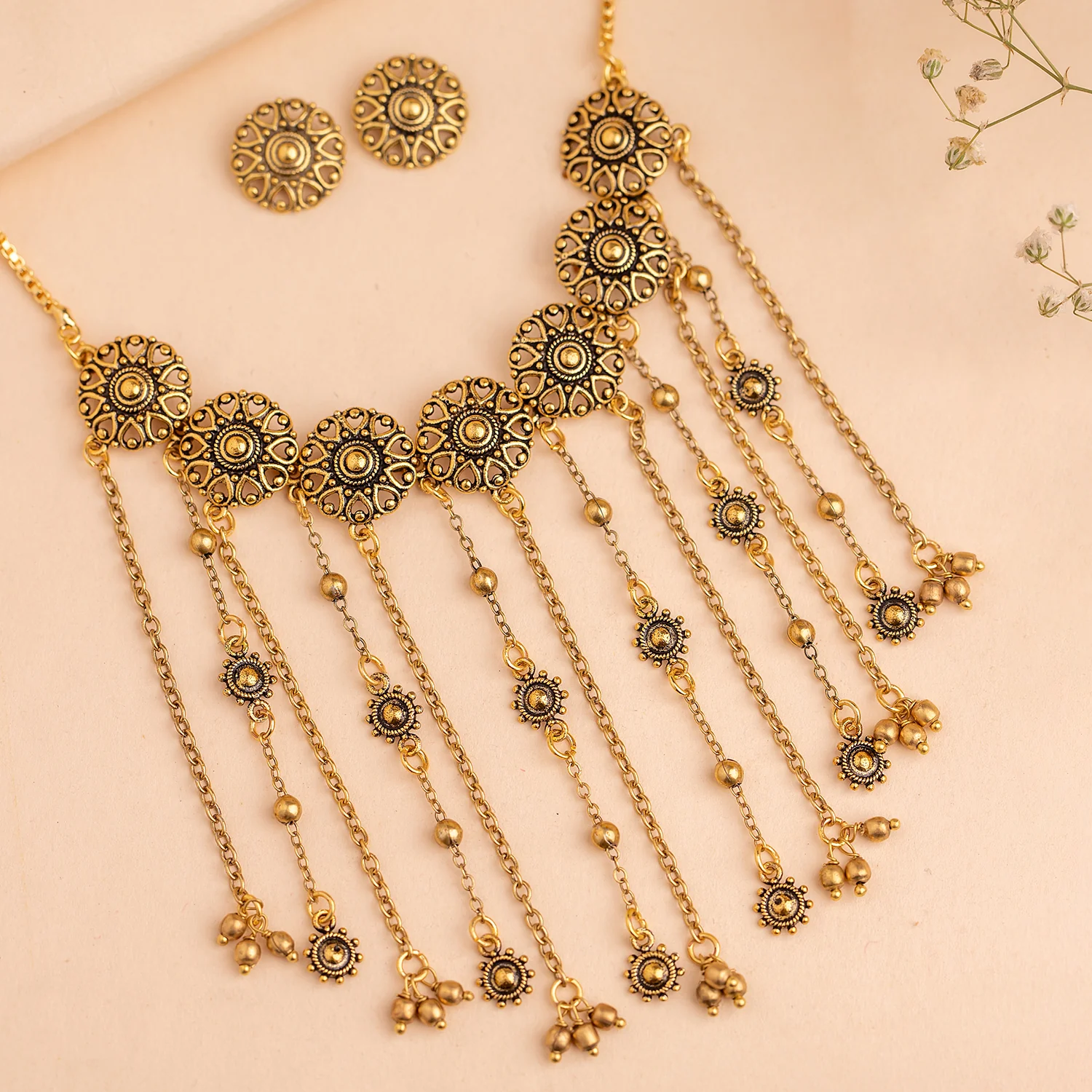 Boho Tribe Lotus Plume Oxidised Pendant Set
